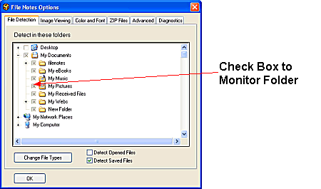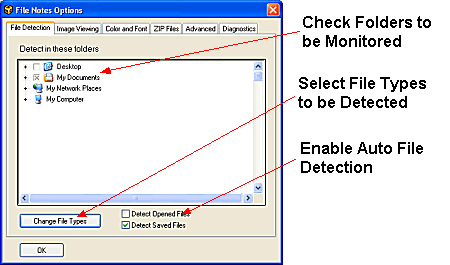 The File Detection tab enables you to configure how FNO3 will monitor and detect files for auto prompting for writing Notes