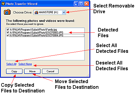| Image files detected by the Photo Transfer wizard | .BMP, .GIF, .JPG, .PPM, ,PBM, .PGM, .TIF, .WMF, .PCX, .RLE, .PNG, .DIB, .TGA, .WMF, .EMF, .AVI, .MPG, .MPEG |