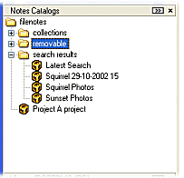 The Search Results folder contains Catalogs of the results of file and Note searches performed by FNO3 (See Main Toolbar Tools Menu).