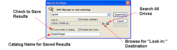 Normal Collections rules apply to search results: Search results catalogs are pointers to the original files, any Notes added to search results files are added to the original file.