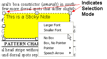The appearance of the Sticky Note can be modified by using the right click menu when the mouse cursor is over the Sticky Note while the Note is in Selection Mode (as shown below).