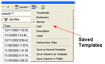 | Thumbnails, Bookmarks, Normal, Path, | Saved Templates List. Available Columns Templates for selection |